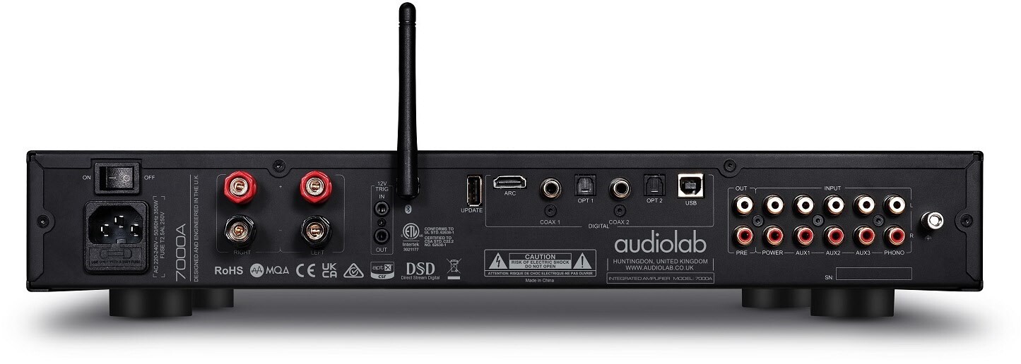 In Sachen Konnektivität lässt der audiolab 7000A kaum Wünsche offen. Für den analogen Bereich stehen 3 Cinch-Eingänge sowie ein hochwertiger MM-Phono-Eingang zur Verfügung. Daneben gibt es auch einen Power-Eingang, für zum Beispiel externe Vorstufen. Wer seine Geräte digital anschließen möchte, kann dieses über je zwei Coax- und SPDIF-Anschlüsse tun. Als weiteres Highlight verfügt der audiolab 7000A über einen HDMI-ARC Anschluss, sodass auch der moderne Smart-TV direkt und unkompliziert angeschlossen werden kann. Dank seinem USB-B Eingang, ist auch eine Verbindungsmöglichkeit mit dem PC gegeben. Die Wiedergabe über das Mobilgerät ist dank Bluetooth aptX/aptX LL möglich.