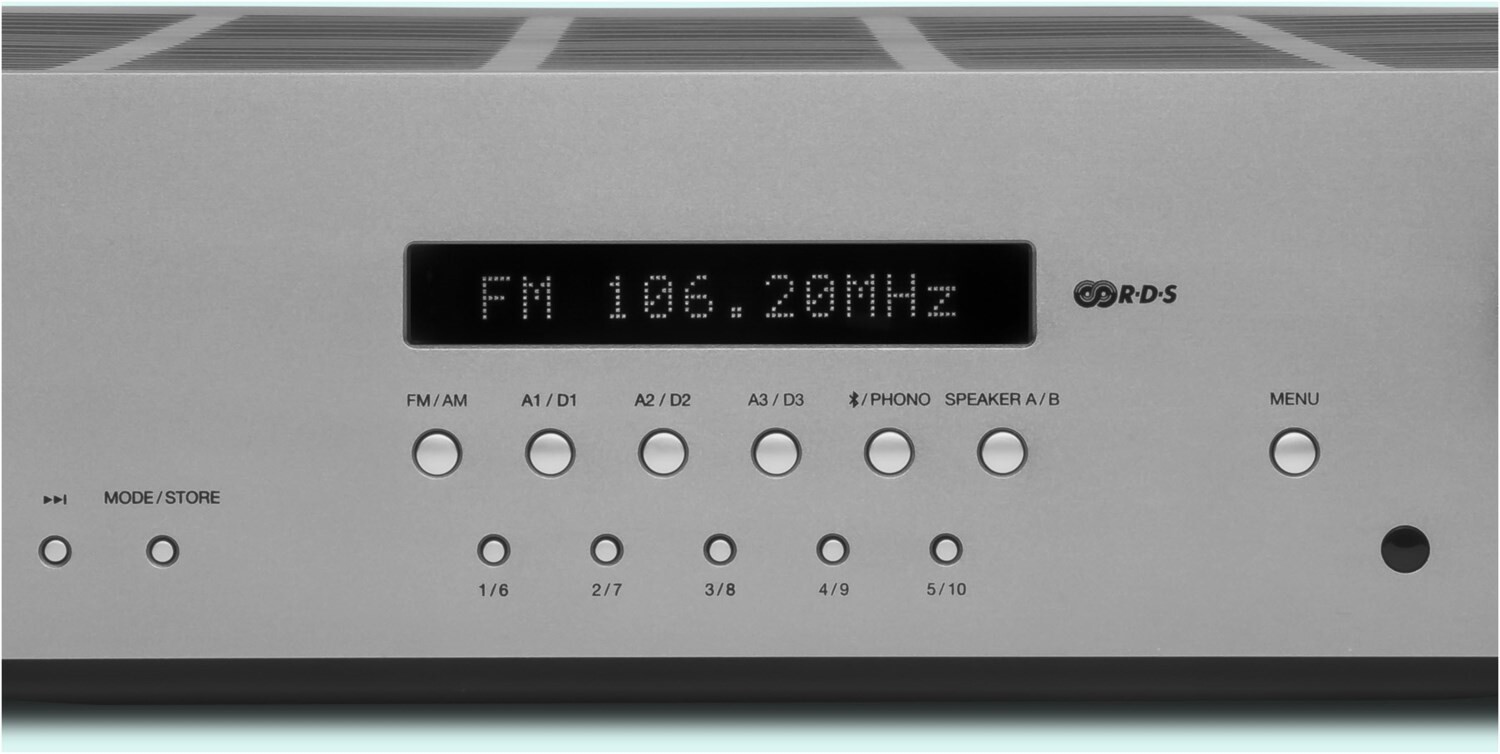 Darüber hinaus verfügt er über analoge und digitale Eingänge, einen Phono-Vorverstärker sowie einen FM/AMReceiver mit RDS und einem 3,5 mm-Eingang. Nicht zuletzt ermöglicht Ihnen der integrierte Bluetooth-Receiver, Ihre Lieblingsmusik vom Smartphone, Tablet oder PC wiederzugeben.