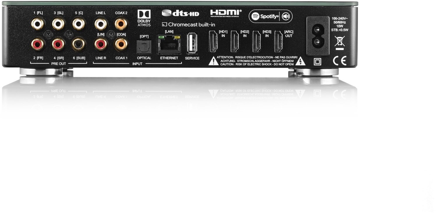 Selbst bei einem analogen Röhrenverstärker lässt sich so Virtual Atmos genießen. Die variable Anschlussvielfalt und Bedienfreundlichkeit mit 4K kompatiblen HDMI Anschlüssen setzen neue Maßstäbe in modernem raumfüllenden Musik- und Heimkinoklang. Mit den Features Chromecast built-in und Spotify Connect lässt sich Ihre Lieblingsmusik wireless über WLAN streamen.