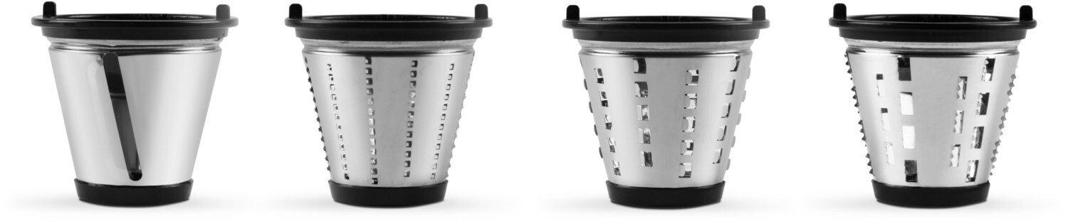 - Konische Form der Einsätze zum leichteren Transportieren des Reibeguts