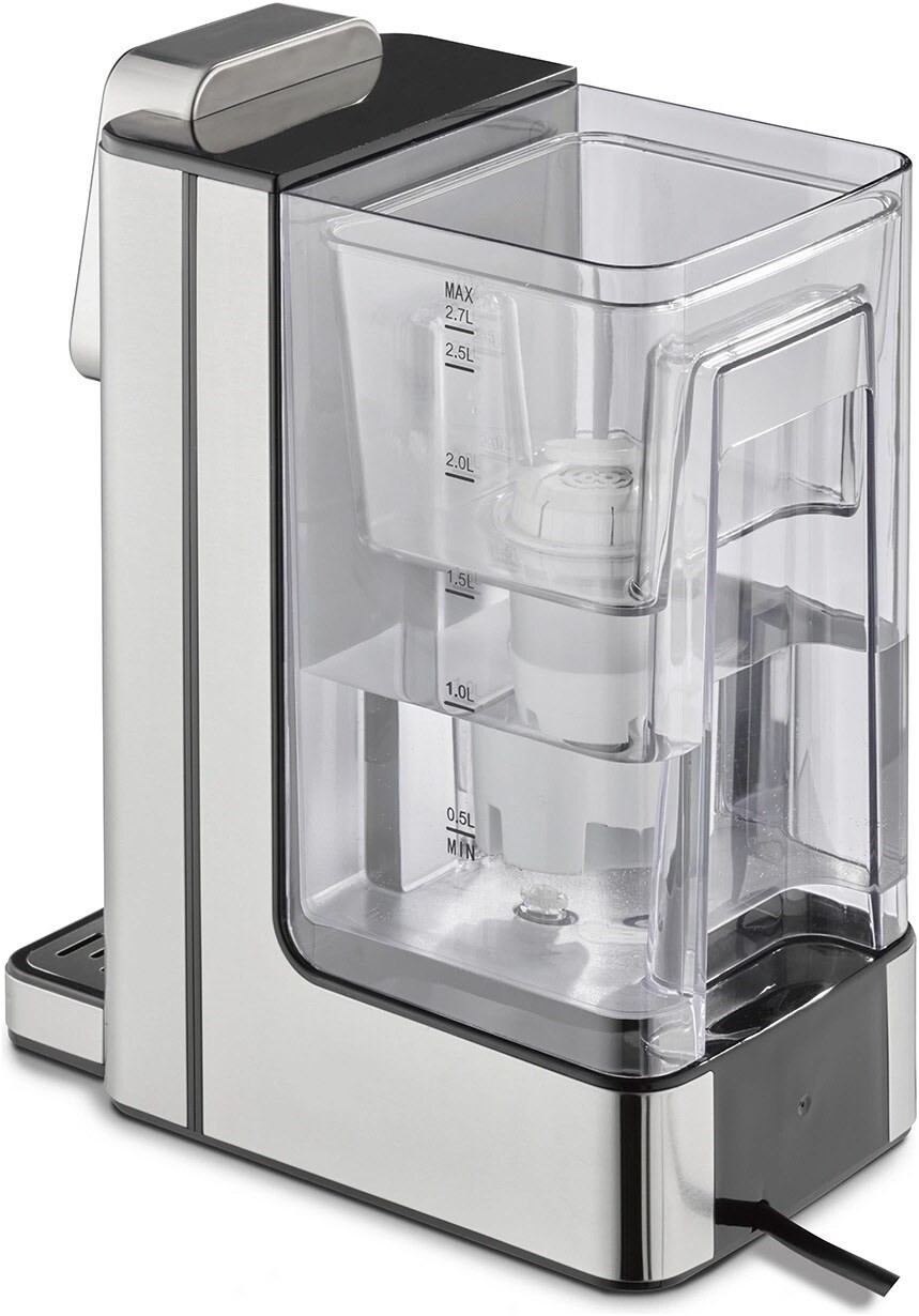 Der abnehmbare 2,7-Liter-Wassertank und der mitgelieferte Wasserfilter sorgen für eine mühelose Reinigung und erstklassige Wasserqualität, während das edle Design aus hochwertigem Edelstahl Ihren Wohnraum stilvoll bereichert.