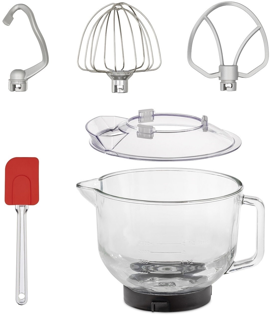 - Knethaken, antihaftbeschichtet; Flachrührer, antihaftbeschichtet; Schneebesen, Spritzschutz mit Einfüllschacht, Silikon-Teigschaber