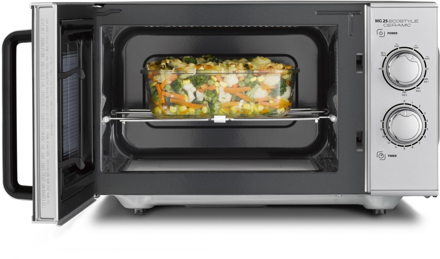 - 5 Mikrowellenstufen, 3 Kombiprogramme (Mikrowelle + Grill) und 1 Grillprogramm