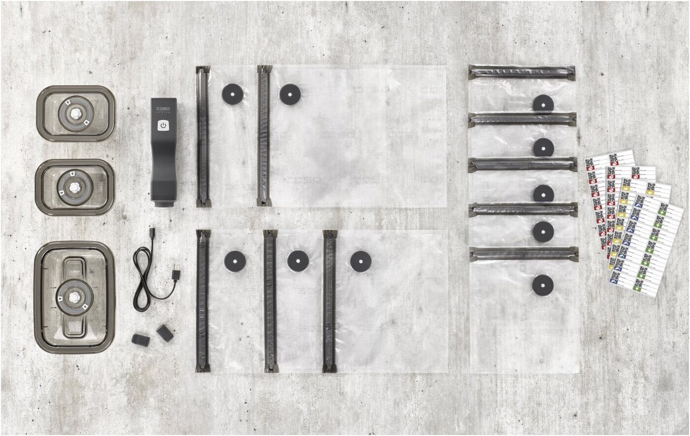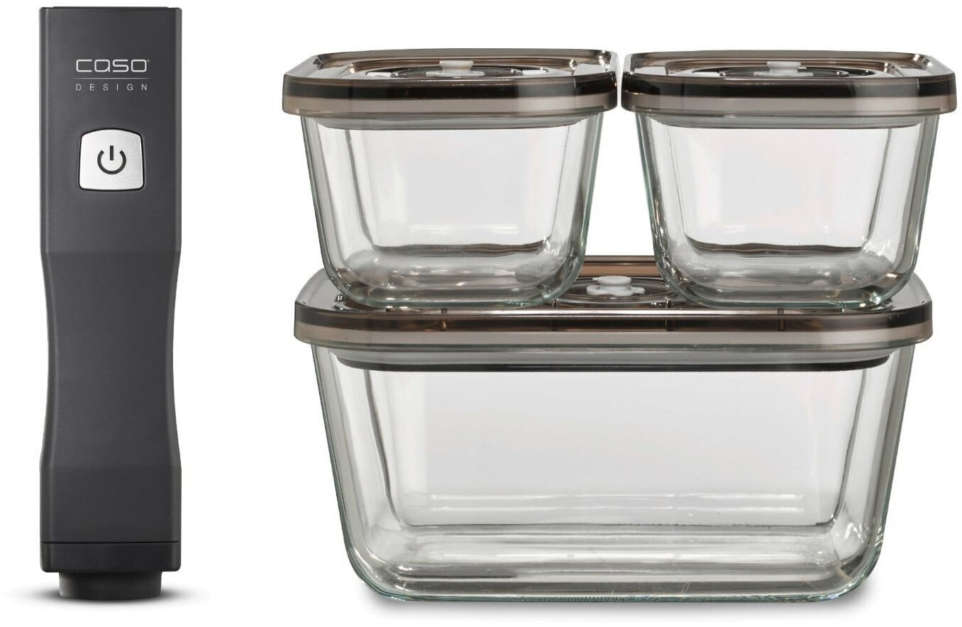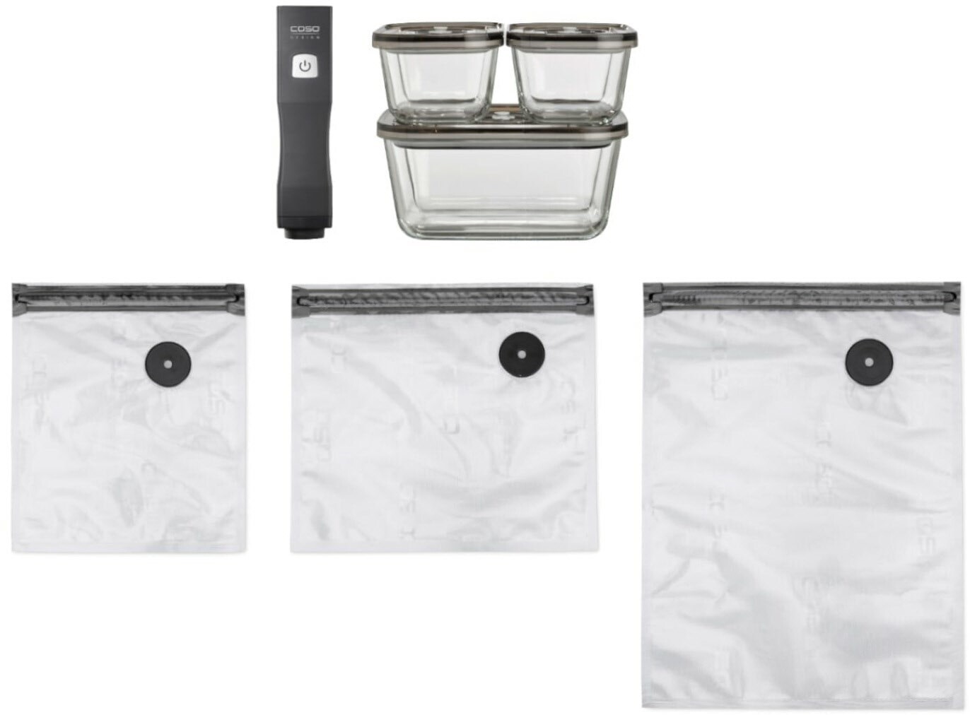 - Inkl. 10 ZIP - Beutel, 3 Vakuum - Behälter, 2 ZIP - Locker, USB-C Ladekabel, CASO Food Manager Sticker
