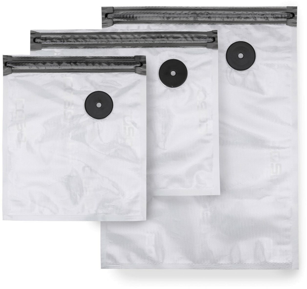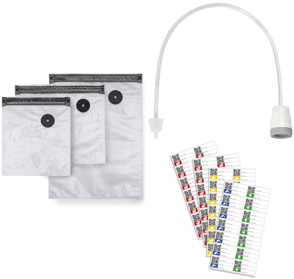 - Inhalt: 5 ZIP-Beutel 20x23 cm, 3 ZIP-Beutel 26x23 cm, 2 ZIP-Beutel 26x35 cm, ZIP-Adapter + Vakuumschlauch und CASO Food Manager Sticker