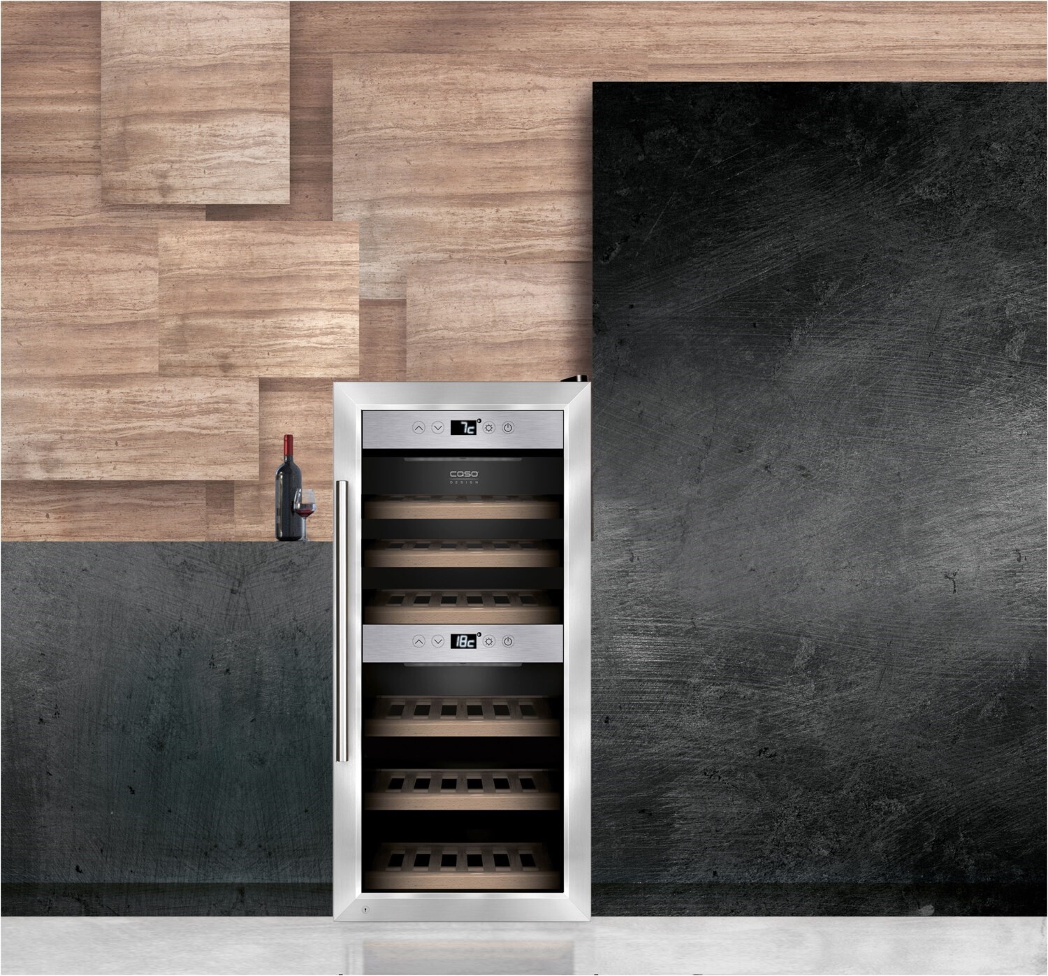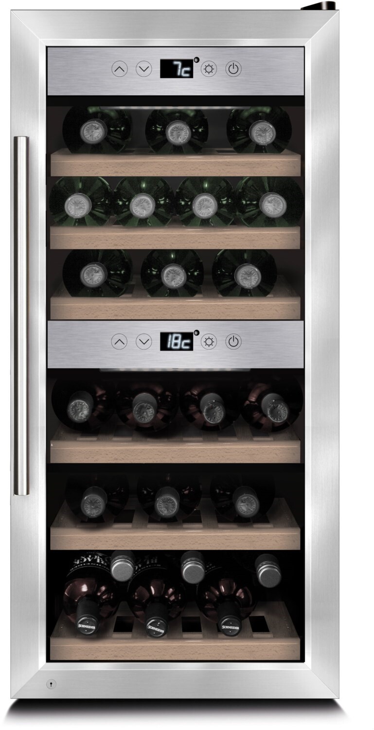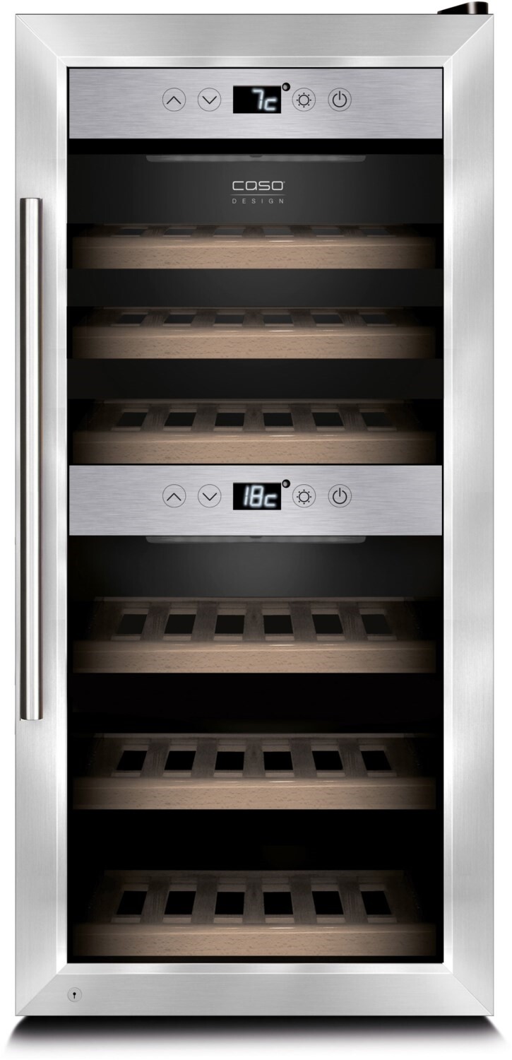 - Zwei getrennte Temperaturzonen, einzeln regelbar für Weiß- & Rotwein