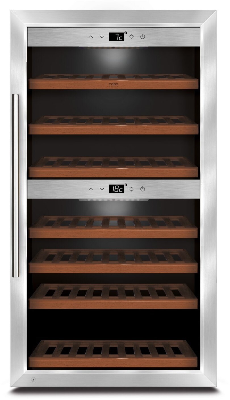 - Zwei getrennte Temparaturzonen, einzeln regelbar für Weiß- & Rotwein