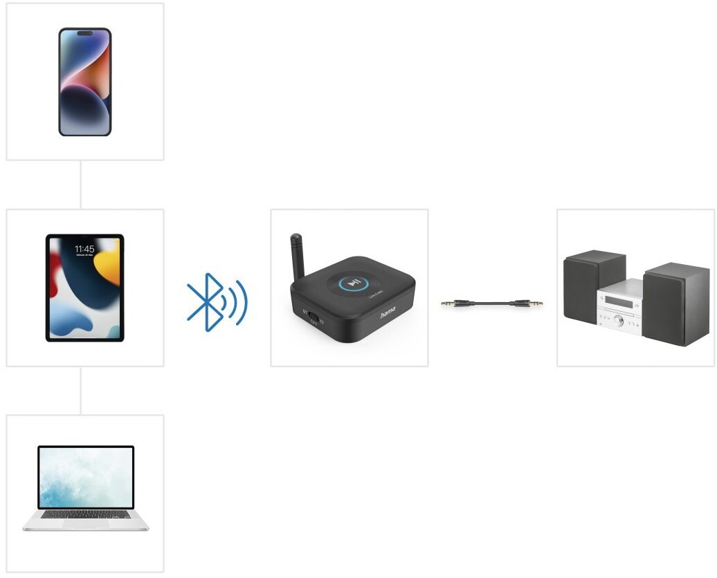 - Ermöglicht eine Audio-Übertragung von einer Bluetooth-fähigen Audioquelle auf nicht Bluetooth-fähige Geräte, z.B. aktive Lautsprecher, TV, Heimkino-Systeme etc.