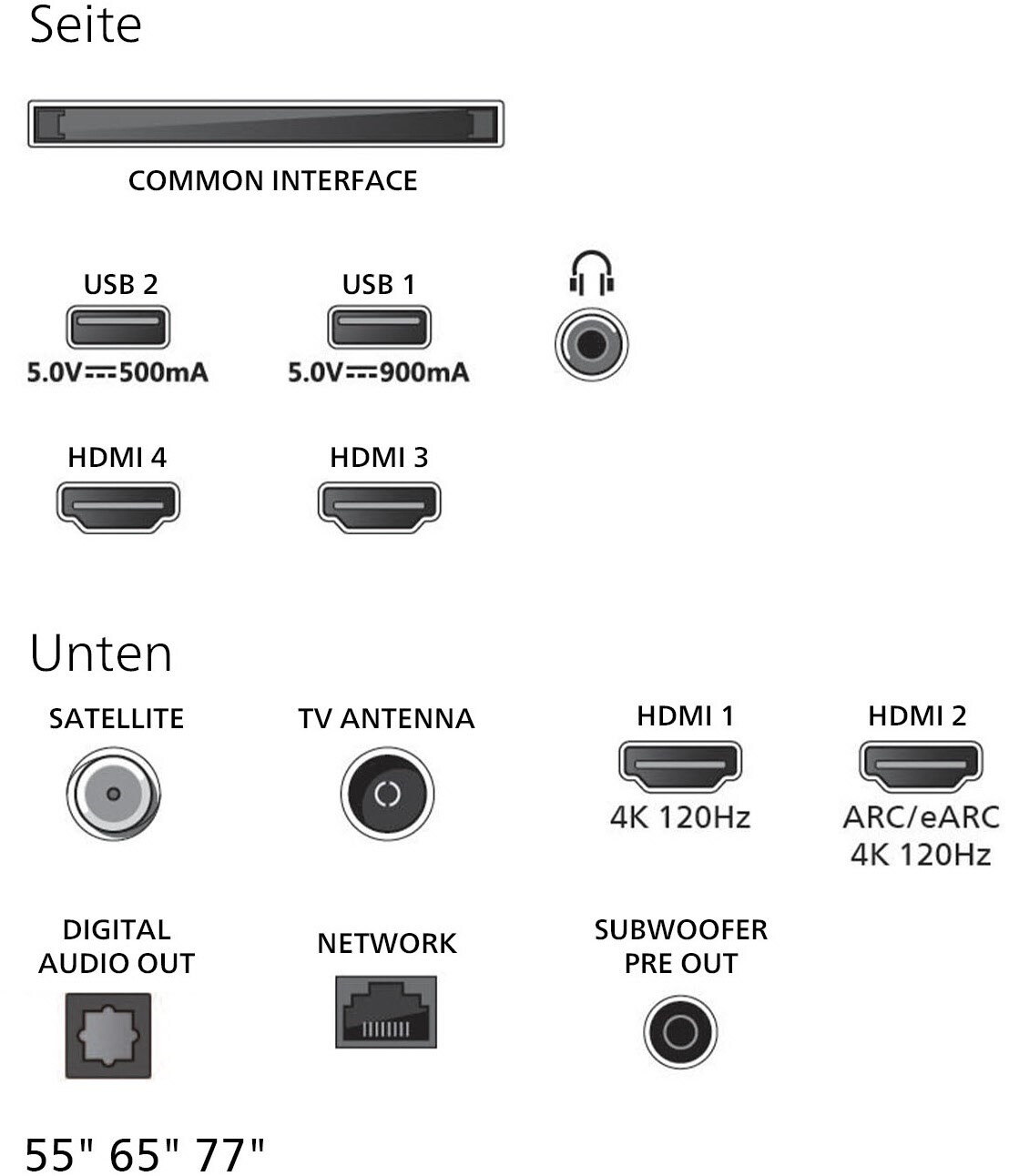 - DVB-T2/-C/-S2 Triple Tuner, 4x HDMI (eARC auf HDMI 2), HDMI 2.1, 2x USB, CI+, Digitaler Audio-Ausgang (optisch), LAN, WLAN 802.11ax (2x2 Dualband) & Bluetooth 5.2 integriert