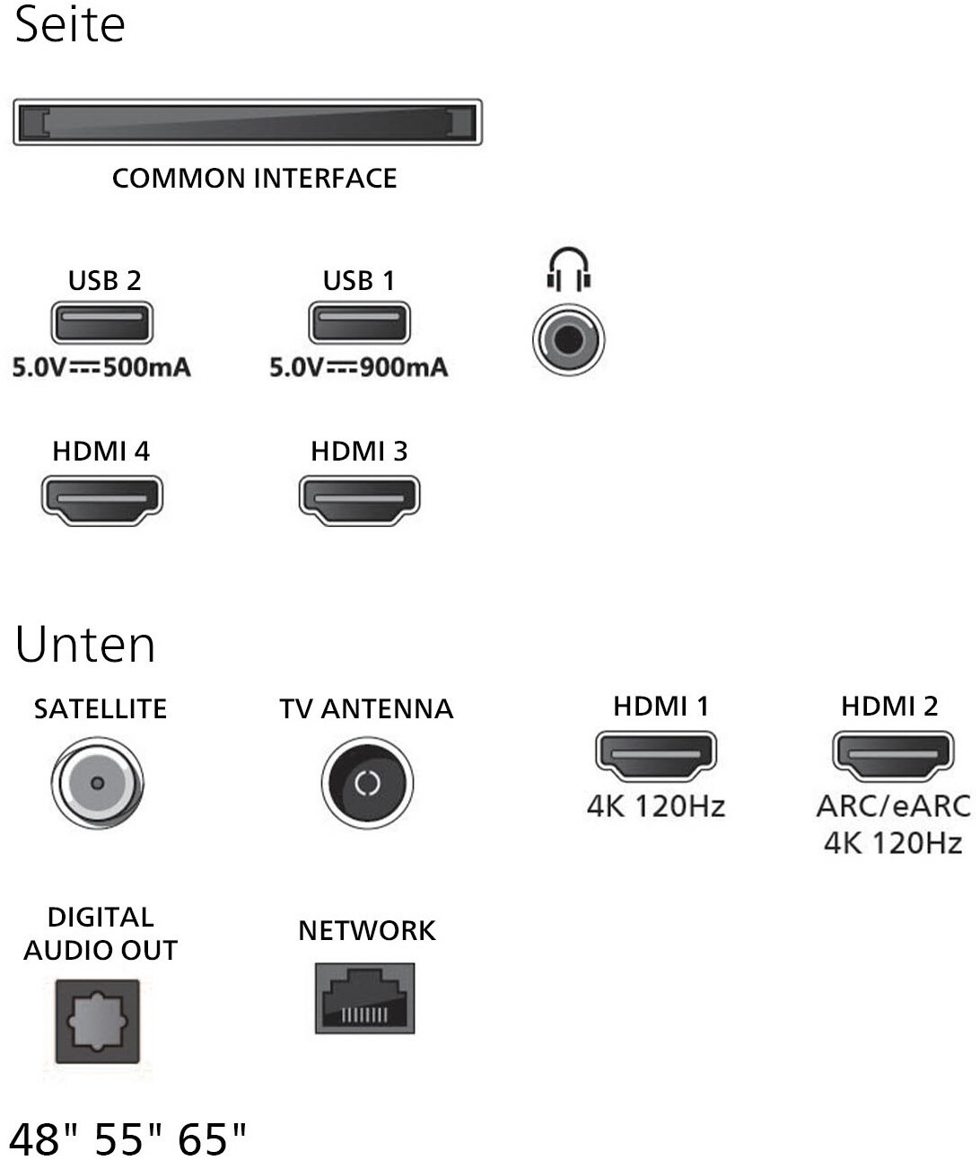 - DVB-T2/-C/-S2 Triple Tuner, 4x HDMI (eARC auf HDMI 2), HDMI 2.1, 2x USB, CI+, Digitaler Audio-Ausgang (optisch), LAN, WLAN 802.11ax (2x2 Dualband) & Bluetooth 5.2 integriert