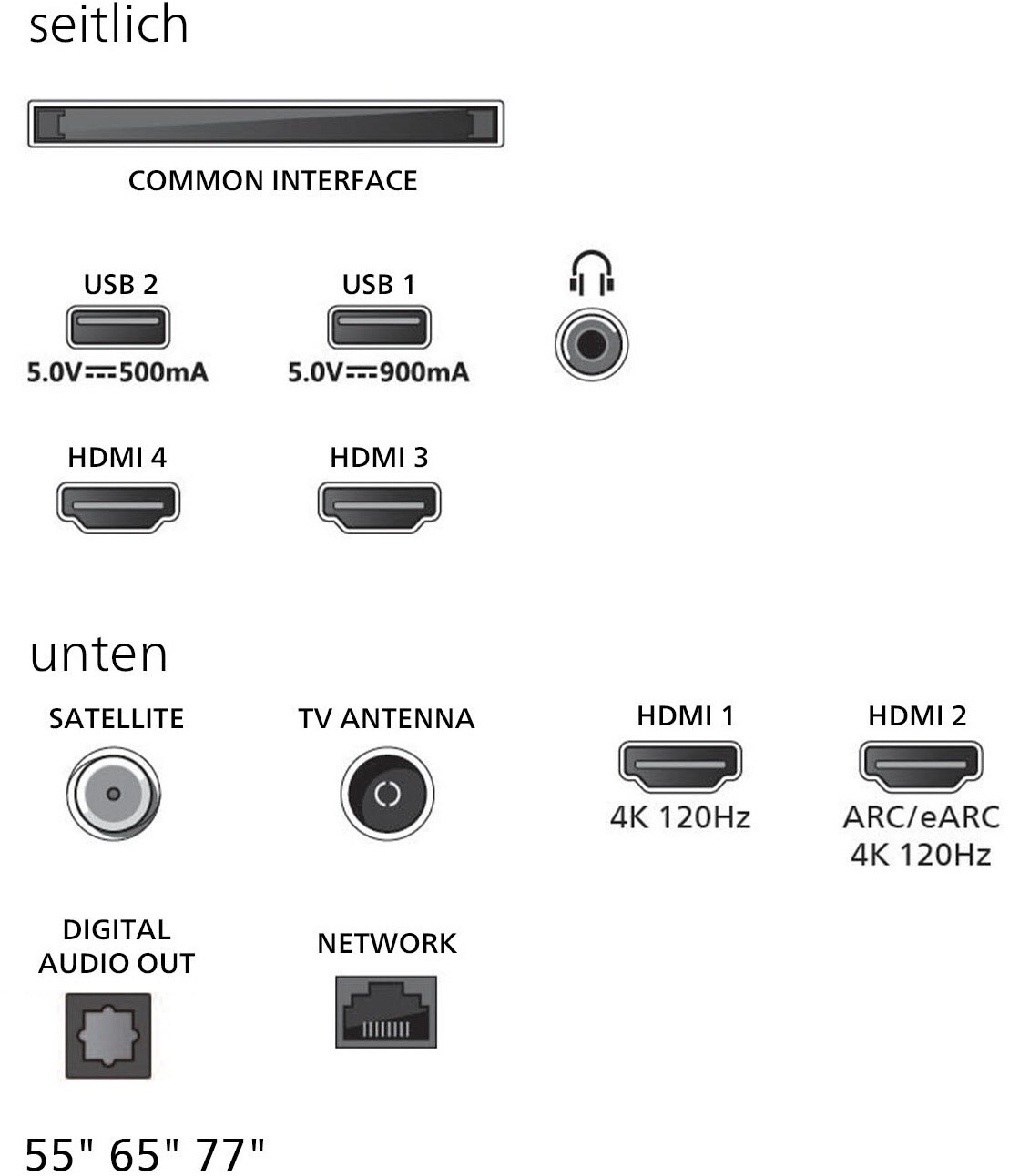 - DVB-T2/-C/-S2 Triple Tuner, 4x HDMI (eARC auf HDMI 2), HDMI 2.1, 2x USB, CI+, Digitaler Audio-Ausgang (optisch), LAN, WLAN 802.11ax (2x2 Dualband) & Bluetooth 5.2 integriert