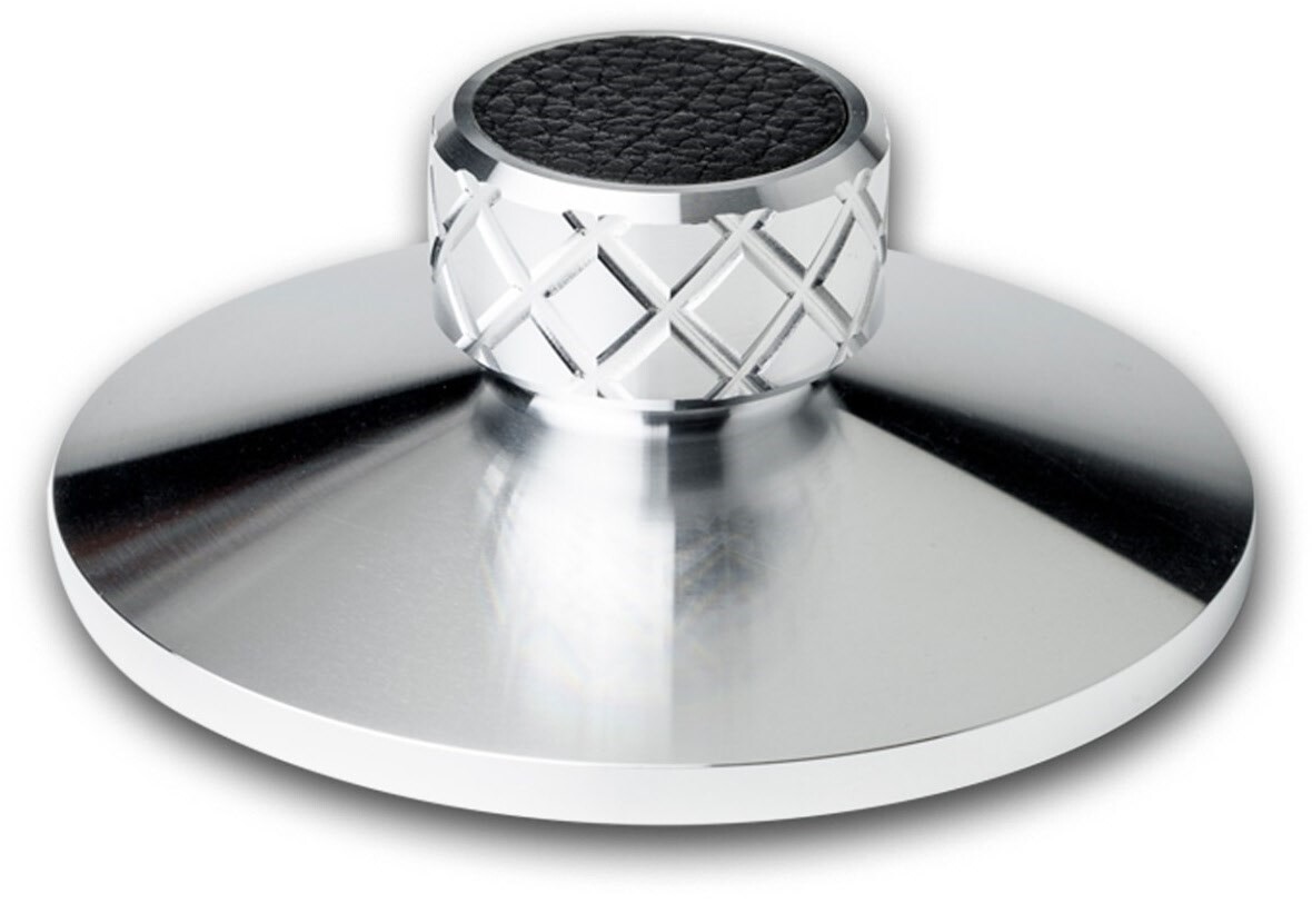 Clamp it vermeidet beide Fehler und stellt die ideale Lösung dar. Der Klemmmechanismus wird einfach auf die Mittelachse des Plattentellers gesteckt, ohne Gewichtserhöhung und damit verbundenem Rumpeln. Der Anpressdruck kann, dem Wölbungsgrad der Platte entsprechend, fein eingestellt werden.