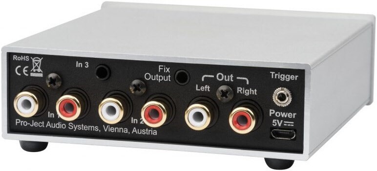Pre Box S2 Analogue bietet drei Line Level Eingänge, zwei Paar RCA Buchsen sowie einem separaten 3,5mm Klinken-Eingang. Drei individuelle analoge Signale können an Endverstärker, wie der Amp Box S2 oder anderen Pro-Ject Box Design Endverstärkern, über die RCA Ausgänge weiter-geleitet werden. Ein fixer 3,5mm Klinken-Ausgang leitet das Signal an zum Beispiel einen Kopfhörerverstärker, wie Head Box S2, weiter. Der 12V Trigger Ausgang kann weitere Produkte mit Trigger Eingängen fernschalten, um zusätzlichen Komfort zu bieten. Die unglaublich niedrigen Verzerrungslevel garantieren ein Hörerlebnis, welches noch nie in dieser Preisklasse zu finden war! Das Gehäuse besteht aus einer soliden Aluminium/Metall Konstruktion und schützt effektiv gegen Vibrationen und elektromagnetischen Interferenzen, dadurch ergibt sich ein Klangbild frei von Störungen. Pre Box S2 Analogue ist in silber oder schwarz verfügbar und kann von jeder 5V Quelle mit Strom gespeist werden.