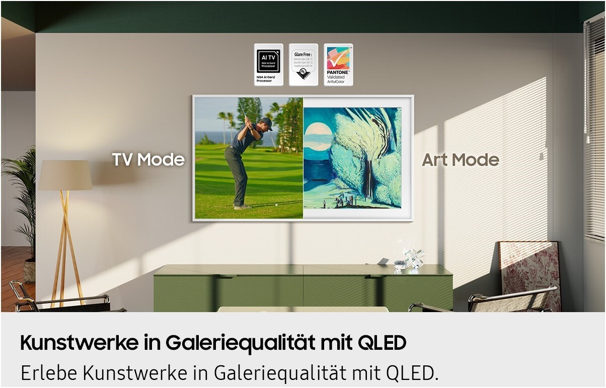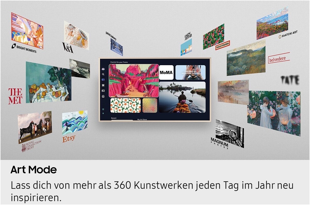 Verwandle mithilfe des Art Modes deine Wohnung in eine virtuelle Kunstgalerie mit wechselnden Kunstwerken, wenn du gerade nicht Fernsehen guckst.