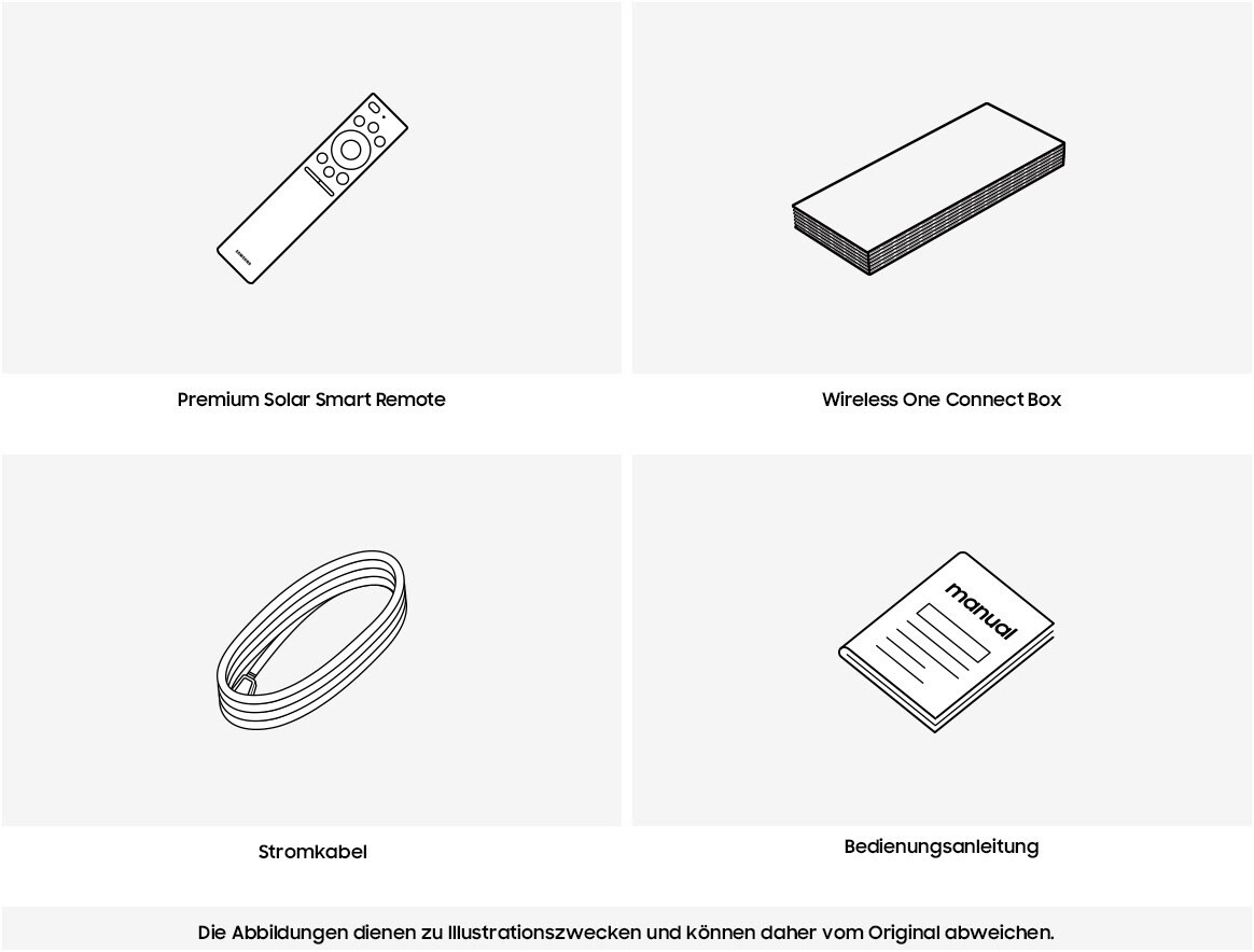* Eine unterbrechungsfreie, kabellose Übertragung in 4K und mit 144 Hz ist möglich, wenn sich das TV-Gerät und die Wireless One Connect Box innerhalb von 10 Metern im selben Raum befinden. Die Leistung kann je nach Umgebung (einschließlich der Wand- und Möbelart) variieren. ** Die Betriebsreichweite kann je nach Umgebung variieren. *** Die Wireless One Connect Box funktioniert unter Umständen nicht einwandfrei, wenn Hindernisse wie Wände die Verbindung zum TV-Gerät beeinträchtigen. **** Die Wireless One Connect Box funktioniert möglicherweise nicht ordnungsgemäß, wenn sie in einem geschlossenen Metallschrank untergebracht ist. **** Das TV-Gerät und die Wireless One Connect Box benötigen einen separaten Stromanschluss.
