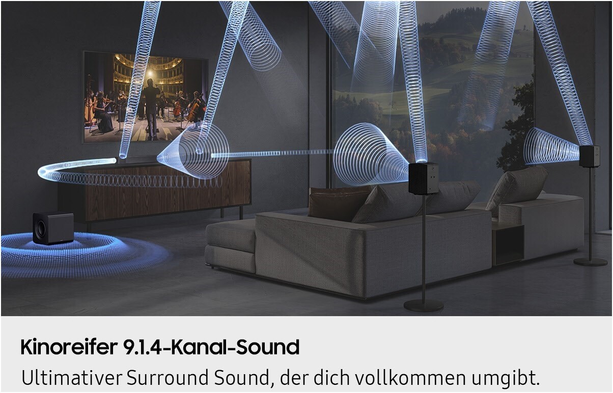 Erlebe ein beeindruckendes Surround-Sound-Erlebnis, bei dem dich 9 Kanäle, 1 Subwoofer-Kanal und 4 nach oben abstrahlende Kanäle vollständig in Sound einhüllen.