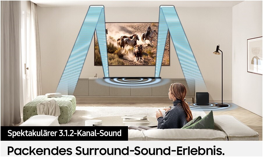 Dank drei Kanälen, einem Subwoofer und zwei nach oben abstrahlenden Kanälen lässt die ultraschlanke 3.1.2-Kanal-Soundbar einen imposanten Klangraum entstehen.