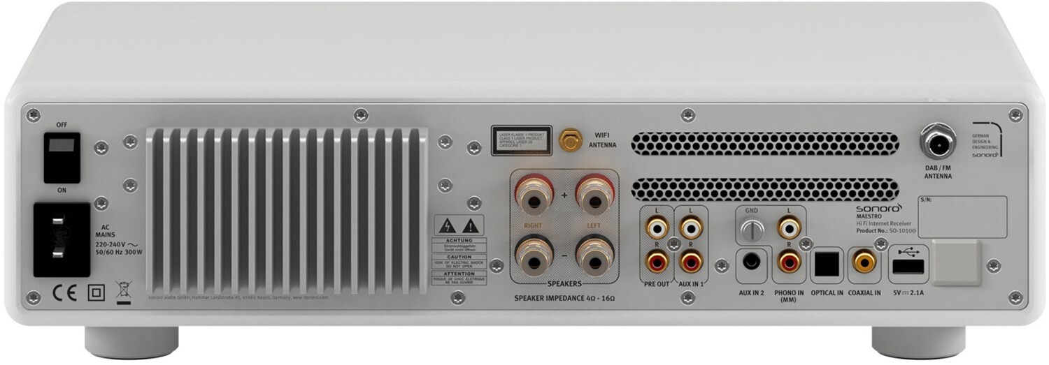 Zusätzlich bietet MAESTRO einen optischen und einen Koaxial-, sowie einen Phono-Anschluss (MM). Bedient wird direkt am Gerät, über die Fernbedienung oder per UNDOK™-App.