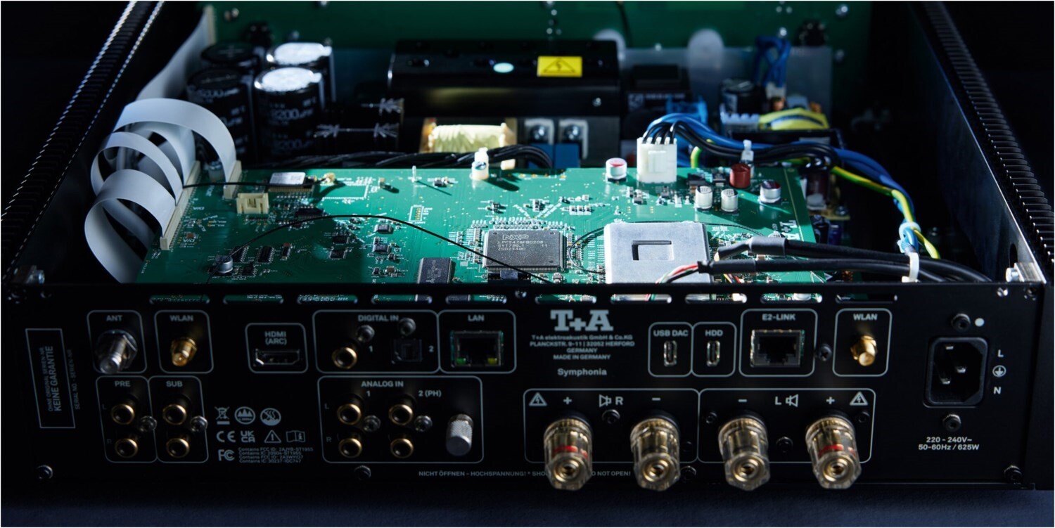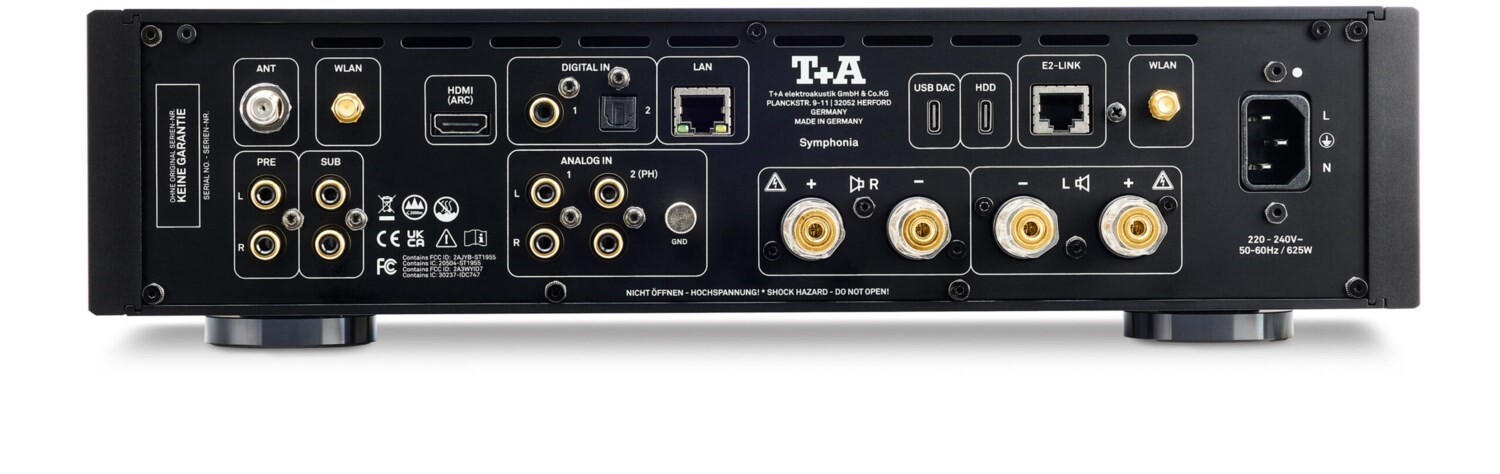 Ihr Motto „The Future of Retro“ interpretiert die Symphonia auch mit ihren Anschlüssen, deren Bandbreite von Analogeingängen für klassische Quellen der letzten Dekaden, über digitale, HDMI- und USB-Eingänge für Spielekonsolen und Fernseher oder USB-Massenspeicher bis hin zu einem integrierten Vorverstärker für Plattenspieler reicht.