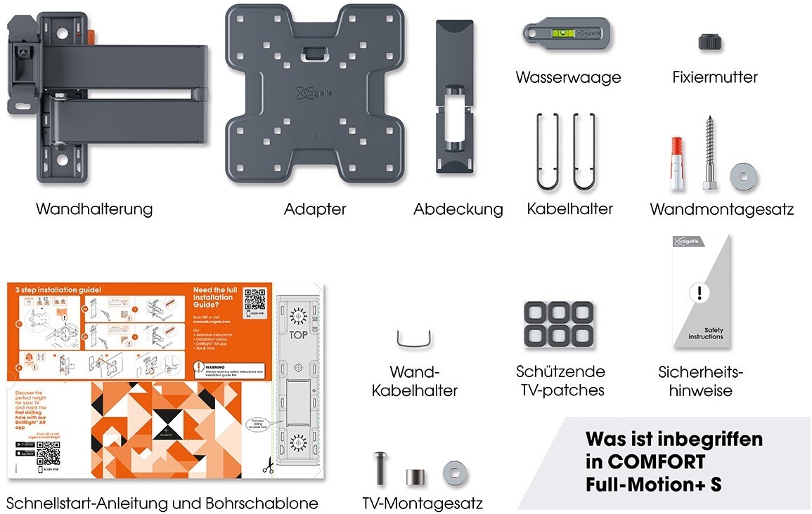 Die Installation Ihrer COMFORT Full-Motion+ TV-Wandhalterung ist ganz einfach. Und Vogel's hilft Ihnen sogar noch weiter. Denn in der Verpackung sind eine Bohrschablone, Schrauben, DuoPower-Dübel von Fischer®, Kabelbinder und Wasserwaage enthalten. Mit unserer kostenlosen DrillRight app ist auch das Anzeichnen des ersten Bohrlochs ganz einfach, und alle Montage-Anweisungen sind in der Kurzanleitung zur Installation prägnant beschrieben. Das ausführliche Handbuch und das Installationsvideo sind online verfügbar.
