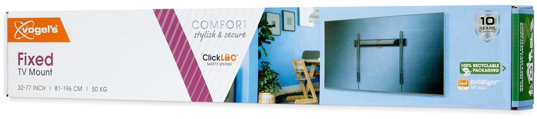 Die COMFORT Fixed TV-Wandhalterungen von Vogel's sind mit dem Dreifachen ihrer maximalen Tragfähigkeit getestet worden. Mit dem ClickLoc™-Security System wird Ihr Fernseher mit einem hörbaren Klick sicher an der Wandhalterung befestigt. Schutzkappen verhindern, dass die Rückseite des Fernsehers bei der Installation zerkratzt wird.