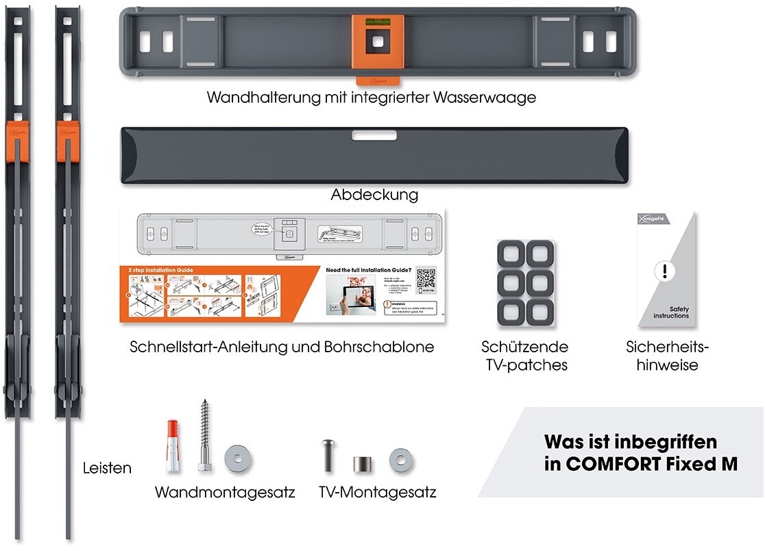 COMFORT Fixed TV-Wandhalterungen sind für eine einfache Installation konzipiert worden. Die Kurzanleitung zur Installation hilft Ihnen dabei. Eine detaillierte Anleitung und ein spezielles Installationsvideo finden Sie online. In der Verpackung sind auch eine Bohrschablone, Schrauben und DuoPower-Dübel von Fischer® enthalten. Das bedeutet, dass Sie sich direkt an die Arbeit machen können. Unsere kostenlose DrillRight app erleichtert das Anzeichnen des ersten Bohrlochs, und die Wandhalterung verfügt auch über eine eingebaute Wasserwaage, was ebenfalls praktisch ist.