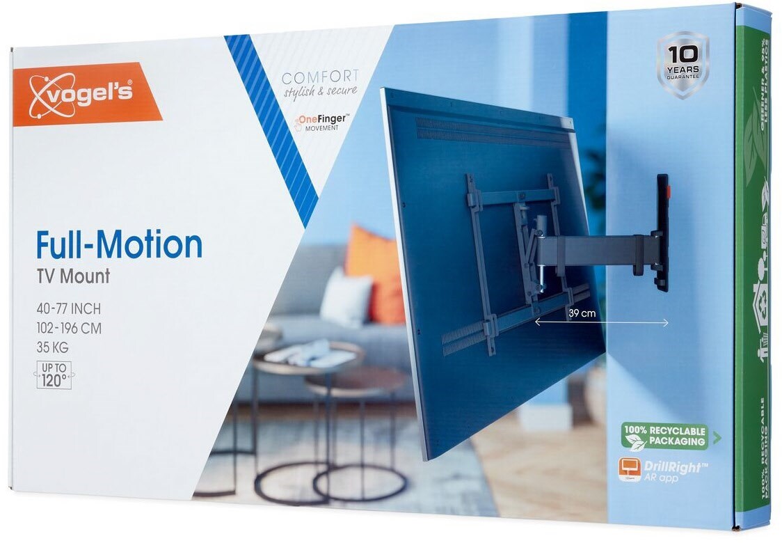 Drehen Sie Ihren Fernseher um bis zu 120° und neigen Sie ihn um bis zu 20°. Die Installation Ihrer Vogel's COMFORT Full-Motion TV-Wandhalterung ist ganz einfach. Und Vogel's hilft Ihnen sogar dabei. Im Lieferumfang sind nämlich eine Bohrschablone, Schrauben, DuoPower-Dübel von Fischer®, eine Wasserwaage und Kabelbinder enthalten. Das erste Bohrloch markieren? Ganz einfach mit der kostenlosen DrillRight™ AR App von Vogel's. Die COMFORT Full-Motion TV-Wandhalterungen von Vogel's sind mit dem Dreifachen ihrer maximalen Tragfähigkeit getestet worden. Sie erfüllen daher die strengsten Sicherheitsstandards.