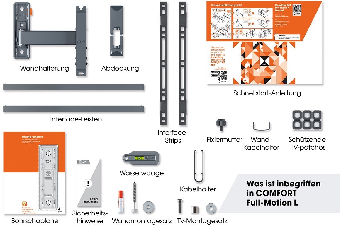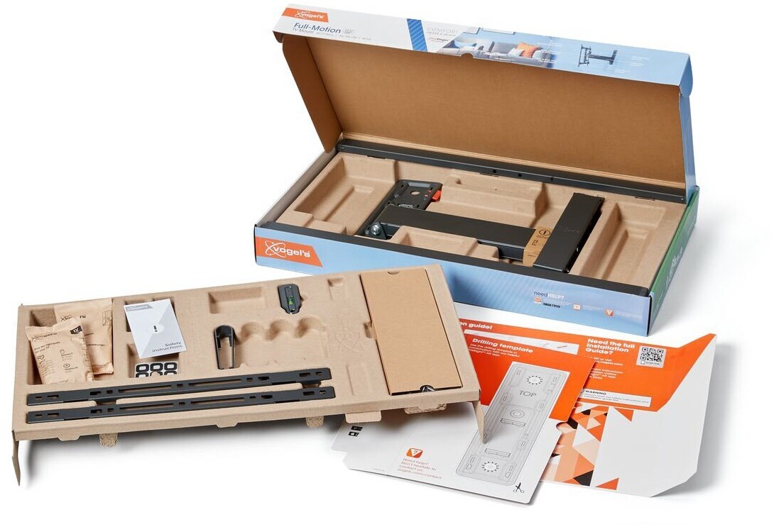 Die Installation Ihrer COMFORT Full-Motion TV-Wandhalterung ist nicht schwer. Vogel's macht es Ihnen sehr einfach. Eine Bohrschablone, Schrauben, DuoPower-Dübel von Fischer®, Kabelbinder und Wasserwaage sind in der Verpackung enthalten. Markieren Sie einfach das erste Bohrloch mit unserer kostenlosen DrillRight app, und die Kurzanleitung zur Installation erklärt Ihnen Schritt für Schritt, wie Sie alles installieren. Online können Sie sich auch das ausführliche Handbuch und das spezielle Installationsvideo anschauen.
