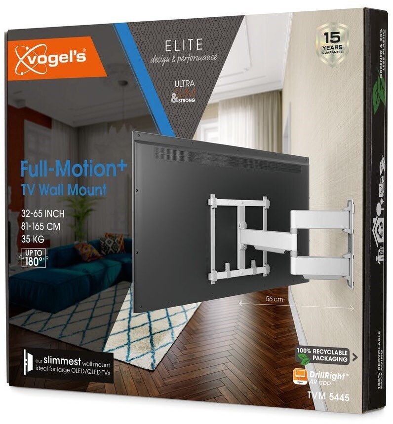 Die ELITE Full-Motion+ TV-Wandhalterung ist dank der beiliegenden Schnellmontageanleitung mit Erklärungen einfach zu installieren. Brauchen Sie weitere Hilfe? Ein ausführliches Handbuch und ein Installationsvideo sind online verfügbar. Wasserwaage, Bohrschablone, Schrauben und DuoPower-Dübel von fischer® sind im Lieferumfang enthalten. Und mit der kostenlosen DrillRight™ AR App von Vogel’s ist es ganz einfach, Ihr erstes Bohrloch zu markieren. Weiche Schutzkappen an der Wandhalterung schützen die Rückseite Ihres Fernsehers während der Montage.