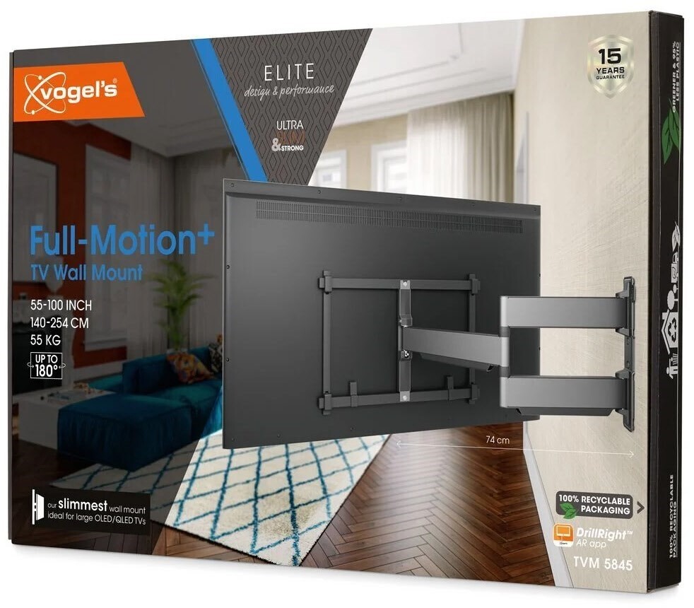 Die ELITE Full-Motion+ TV-Wandhalterung verfügt über 74 cm lange Tragarme. So können Sie Ihren Fernseher je nach Bildschirmgröße um bis zu 90° nach links und rechts drehen. Dank der One-Finger™ Movement-Technologie von Vogel’s können Sie den idealen Blickwinkel mit nur einem Finger einstellen. Da große, fragile Bildschirme am besten nicht geneigt werden sollten, verfügt die Wandhalterung nicht über eine Neigefunktion.