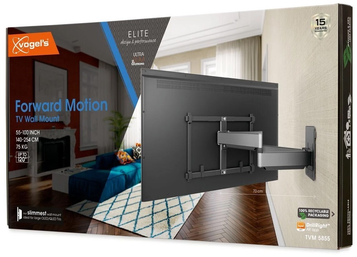Die ELITE Forward Motion TV-Wandhalterung ist eine spezielle, extrastarke Wandhalterung, geeignet für Fernseher von 55 bis 100 Zoll und einem Gewicht von bis zu 75 kg - ideal für Ihren großen OLED- oder QLED-Fernseher. Die ELITE Forward Motion lässt sich um bis zu 120° drehen, sodass Sie Ihren Fernseher in praktisch jedem Winkel nutzen können. Die Wandhalterung ist nicht nur ultrastark, sondern auch ultradünn, denn sie lässt zwischen Fernseher und Wand nur 4,5 cm