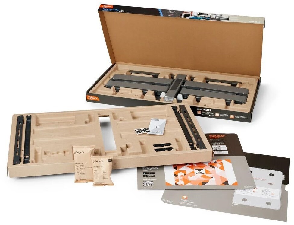 Die ELITE Forward Motion TV-Wandhalterung ist einfach zu installieren. Eine Kurzanleitung für die Installation ist im Lieferumfang enthalten und ein ausführliches Handbuch sowie ein Installationsvideo sind online verfügbar. Alle nötigen Installationsmaterialien sind enthalten: eine Wasserwaage, eine Bohrschablone, eine extra breite Wandplatte, Schrauben und DuoPower-Dübel von Fischer ®. Und mit unserer kostenlosen DrillRight™ AR App können Sie ganz leicht das erste Bohrloch markieren. Ein beruhigendes Detail: weiche Schutzkappen an der Wandhalterung verhindern, dass die Rückseite Ihres Fernsehers bei der Montage verkratzt.