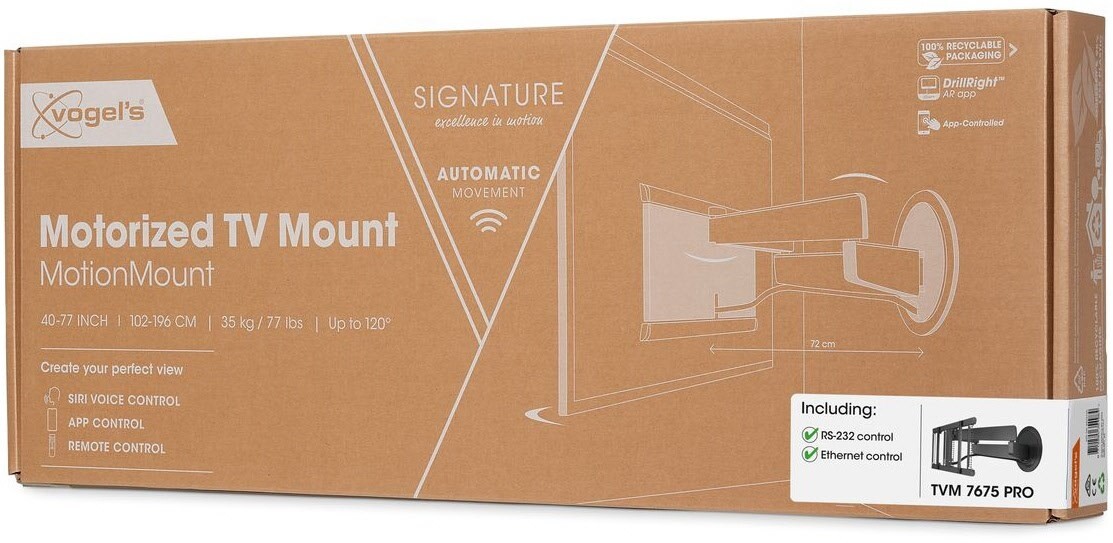 Die Steuerung zeichnet sich durch ihre Einfachheit aus. Wenn der Fernseher oder Bildschirm eingeschaltet wird, bewegt sich die Wandhalterung automatisch in die bevorzugte Einstellung (automatische Bewegung). Für professionelle Anwendungen sind ein Ethernet-Anschluss und ein RS-232-Anschluss vorhanden. So können Sie die Vogel's MotionMount PRO einfach konfigurieren und mit anderen Produkten im Raum koppeln. Der Nutzer kann weiterhin die App oder eine Fernbedienung verwenden. Wenn der Fernseher ausgeschaltet ist, können Sie die Wandhalterung so einstellen, dass sie automatisch in die Ausgangsposition zurückfährt: dicht an der Wand.